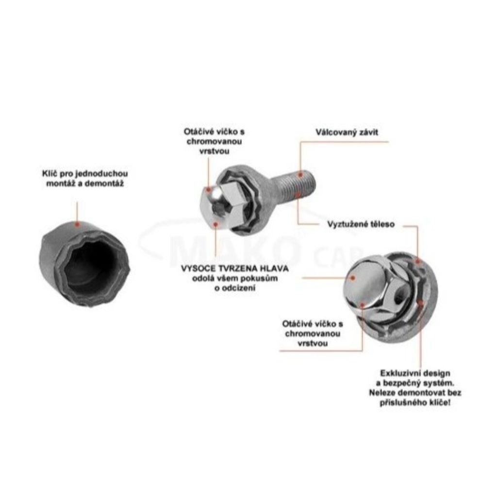 Pojistné šrouby a matice SICUKOSMOS mají nejodolnější a nejbezpečnější pojistný systém z celé nabídky. Díky odolnosti vůči zkroucení vyšší než 400Nm odolá hlavice šroubu jakémukoliv pokusu o krádež kol.