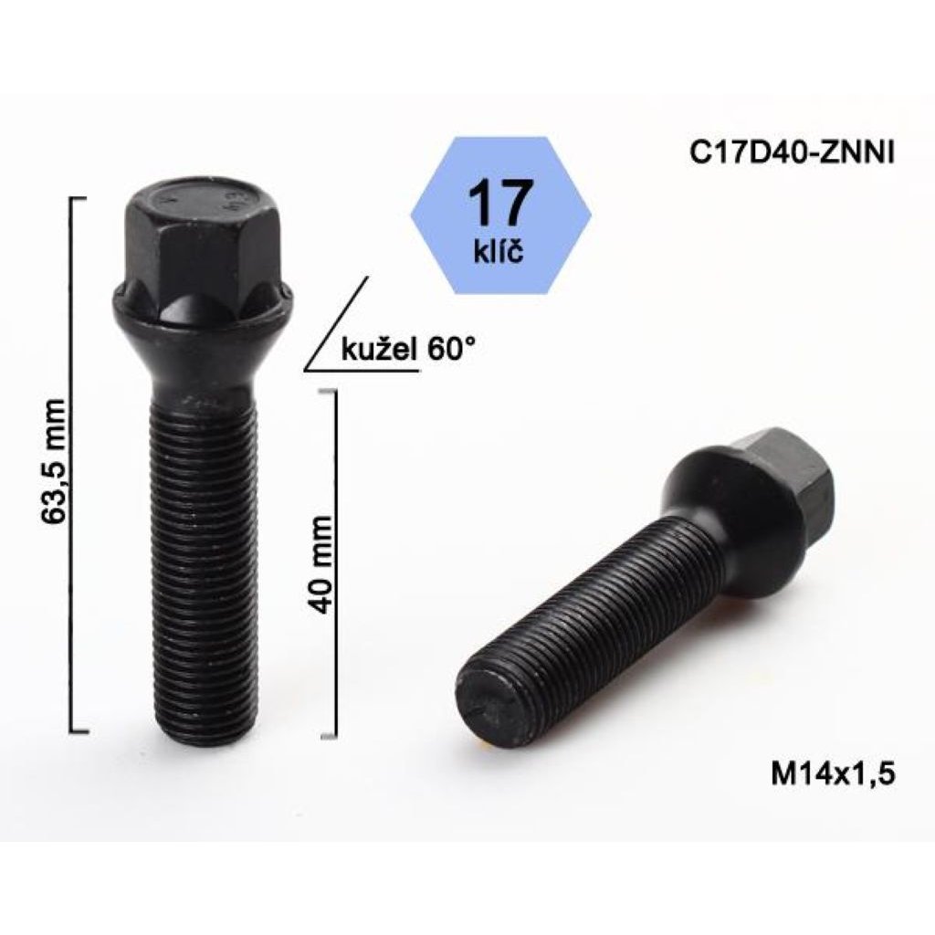 Kolové šrouby M14x1,5x40mm, černá, kužel, klíč 17