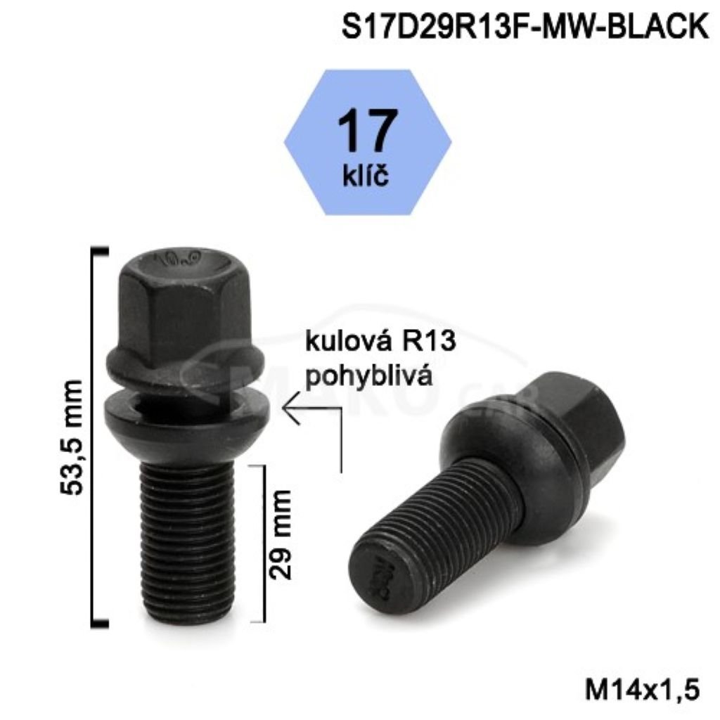 Kolový šroub M14x1,5x29 koule R13 pohyblivá, klíč 17, černý
