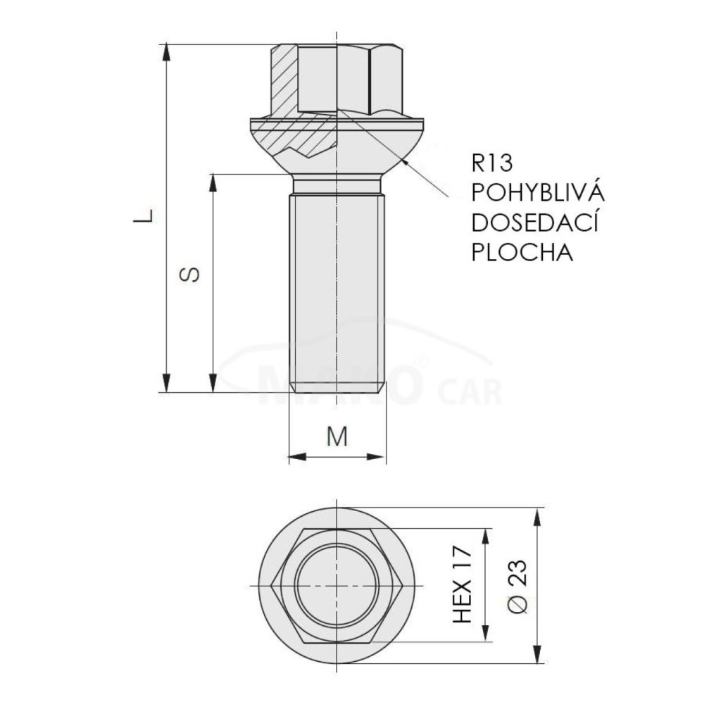 Kolový šroub M14x1,5x29 koule R13 pohyblivá, klíč 17, stříbrný