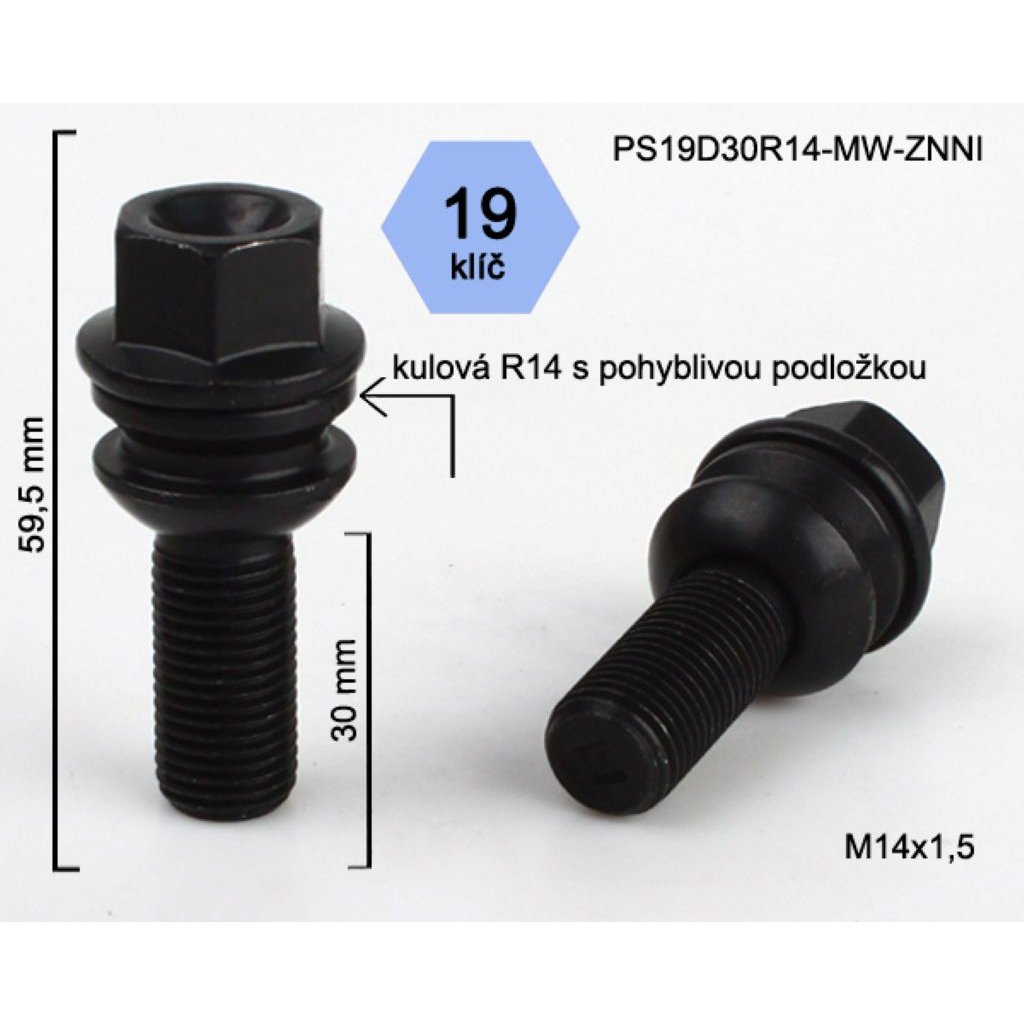 Kolový šroub M14x1,5x30 koule R14 pohyblivá, černý, klíč 19