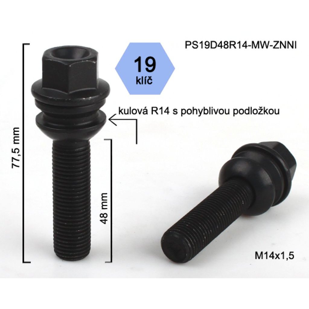 Kolový šroub M14x1,5x48 koule R14 pohyblivá, černý, klíč 19