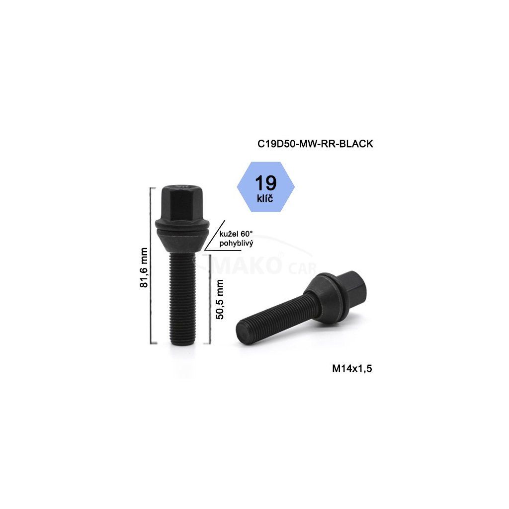 Kolový šroub M14x1,5x50,5 kužel pohyblivý, klíč 19, černý
