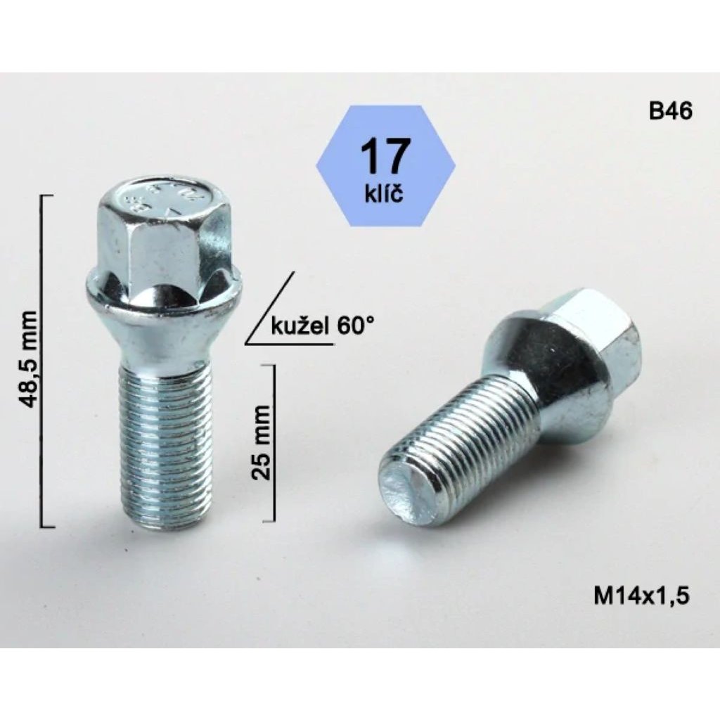 Kolový šroub na originální kola pro vůz Alfa Romeo Spider (939) r.v.2006-2010 roadster, M12x1,25x25, dosedací plocha kužel, klíč 17, stříbrný