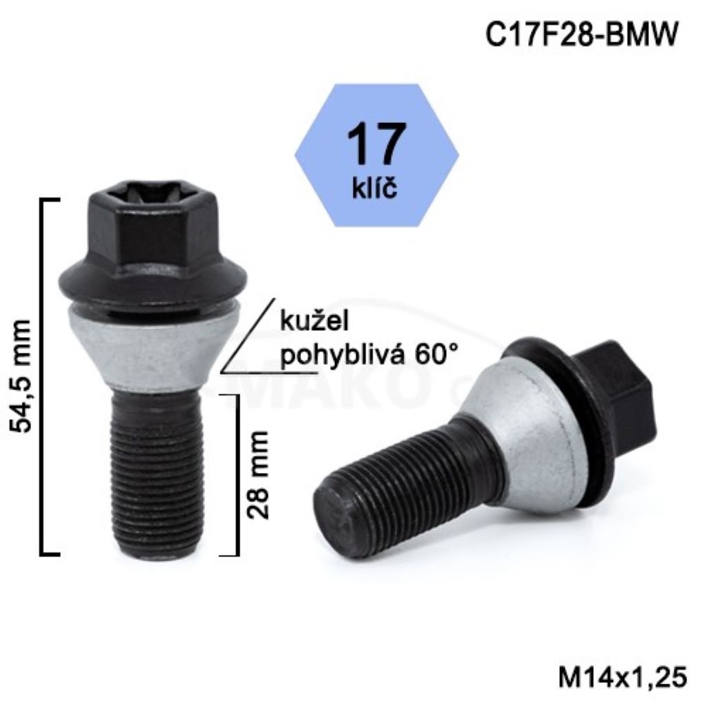Kolový šroub na originální kola pro vůz BMW I7 (G7L, G70) r.v.2022- sedan, M14x1,25x28, dosedací plocha kužel pohyblivý, klíč 17, černý