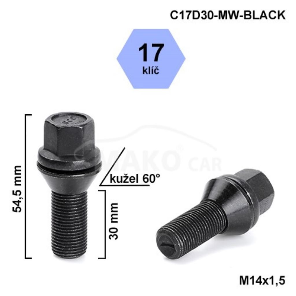 Kolový šroub na originální kola pro vůz BMW X5 (E53, X53) r.v.2000-2006 SUV, M14x1,5x30, dosedací plocha kužel pohyblivý, klíč 17, černý
