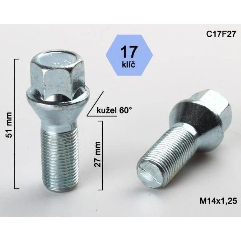 Kolový šroub na originální kola pro vůz BMW X5 (F15, F85, X-N1) r.v.2013-2018 SUV, M14x1,25x27, dosedací plocha kužel, klíč 17, stříbrný