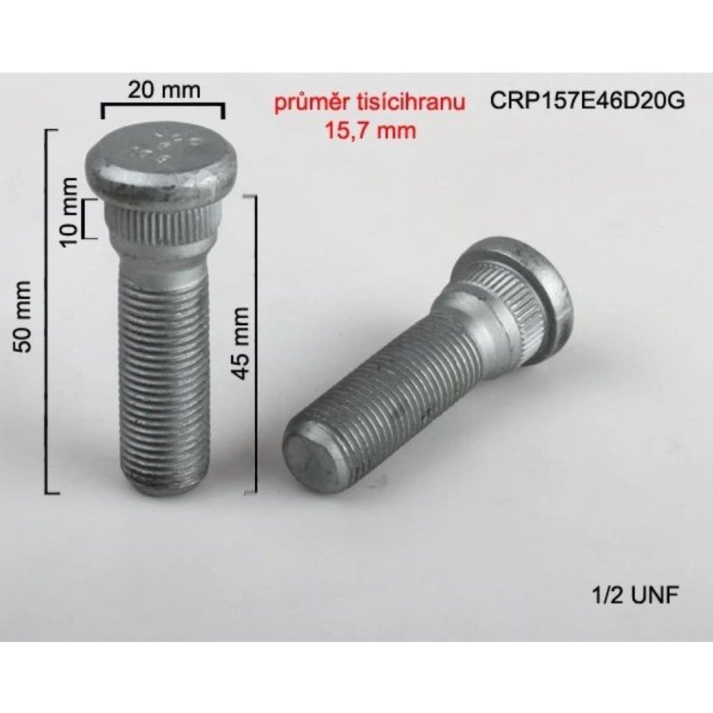 Kolový šteft (svorník) 1/2 UNF 45mm (celková délka 50mm), průměr tisícihranu 15,7 mm.