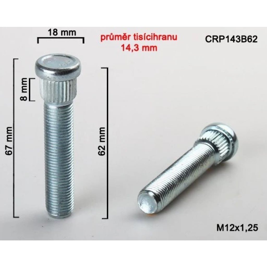 Kolový šteft (svorník) M12x1,25x62mm (celková délka 67mm), průměr tisícihranu 14,3 mm.
