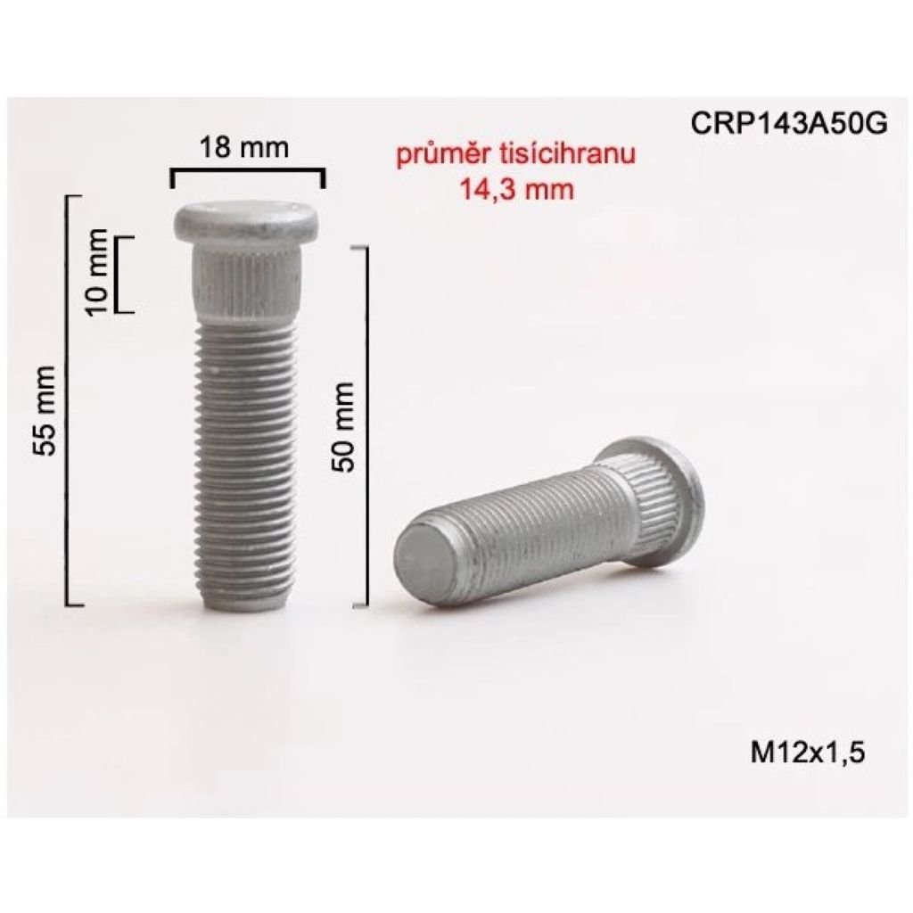 Kolový šteft (svorník) M12x1,5x50mm (celková délka 55mm), průměr tisícihranu 14,3 mm.