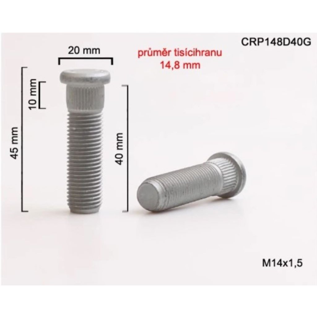Kolový šteft (svorník) M14x1,5x40mm (celková délka 45mm), průměr tisícihranu 14,8 mm.