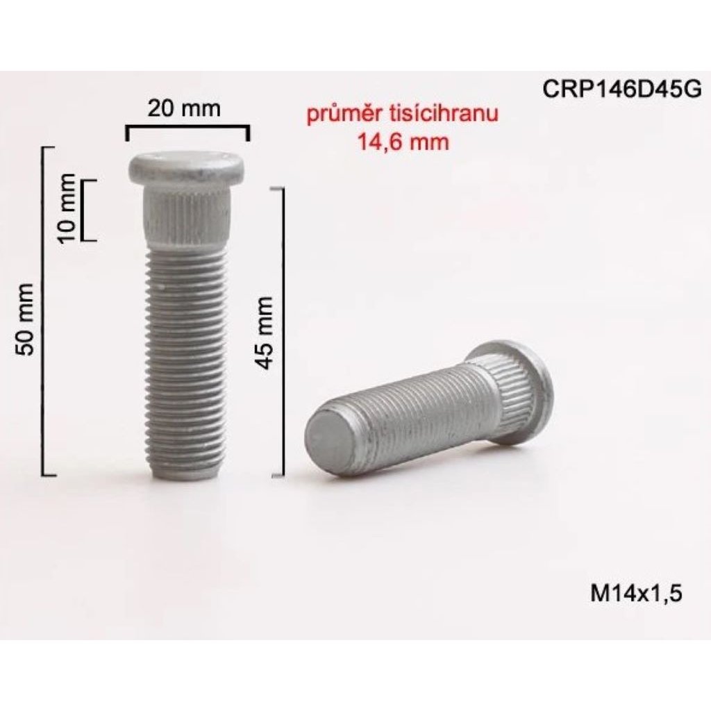 Kolový šteft (svorník) M14x1,5x45mm (celková délka 50mm), průměr tisícihranu 14,6 mm.