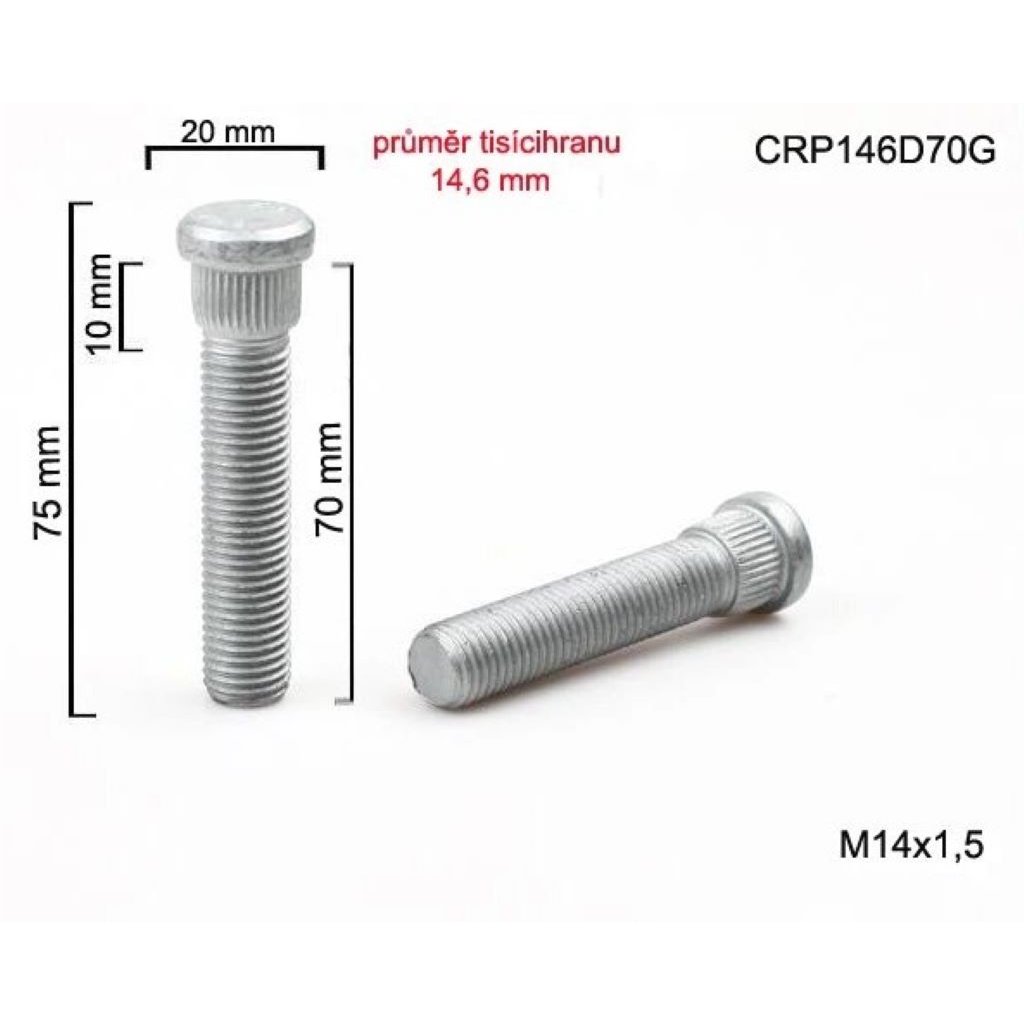 Kolový šteft (svorník) M14x1,5x70mm (celková délka 75mm), průměr tisícihranu 13 mm.
