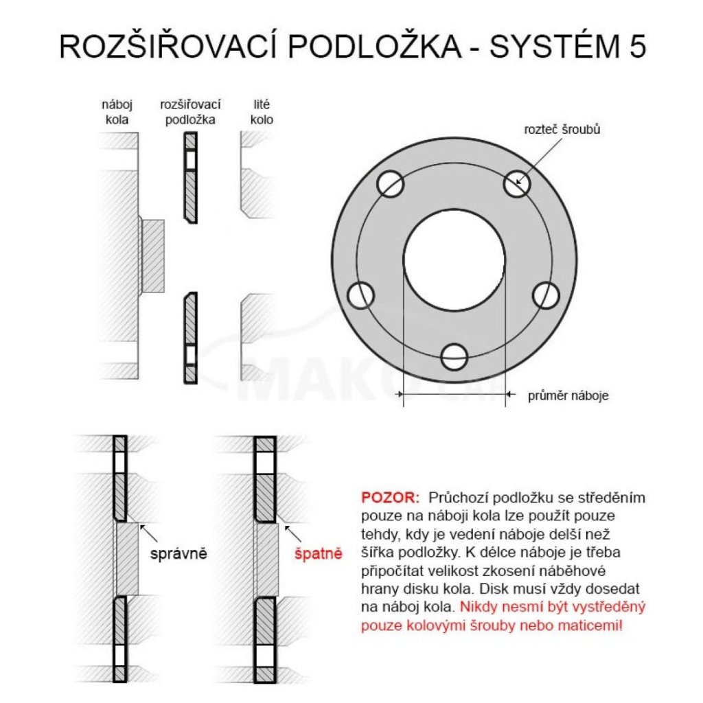 Rozšiřovací podložky bez vystředění na náboji kola (system 5) lze použít pouze tehdy, když je náboj kola delší než šířka podložky. Disk kola musí být vždy na náboji vystředěn. Podložky se upevňují kolovými šrouby (popř. svorníky) které se musí ke každé sadě podložek objednat podle velikosti původních kolových šroubů (nebo svorníků), ale delších o šířku podložky. Je nutné dbát na to, aby jste objednali šrouby shodného provedení tedy kuželová nebo kulová dosedací plocha a stejná velikost závitu. Kolové šrouby můžete použít původní, pokud i s podložkou je kolo dotaženo minimálně na sedm závitů.