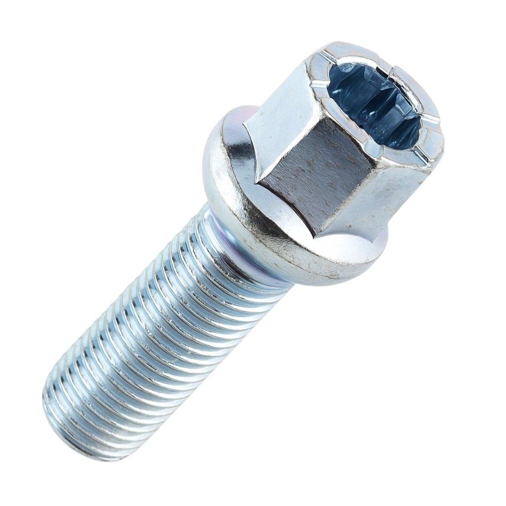 Kolový šroub na plechová kola pro vůz Škoda Enyaq r.v. 2020-, M14x1,5x27, dosedací plocha koule R13, klíč 17, stříbrný