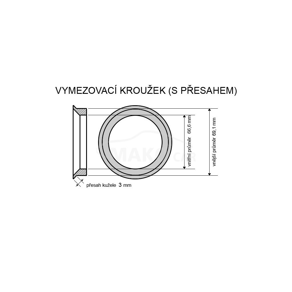 Vnější průměr vymezovacích kroužků, tedy průměr otvoru litého kola je 69,1mm a vnitřní průměr vymezovacího kroužku tedy průměr náboje 66,6mm.